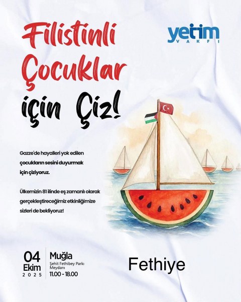 Gazze işgalinin 2. Yılı yaklaşırken, mazlumların sesini duyurmak amacıyla 4 Ekim 2025 Cumartesi günü Fethiye Şehit Fethi Bey Park Meydanında “Filistinli çocuklar için çiz” etkinliği düzenlenecek.